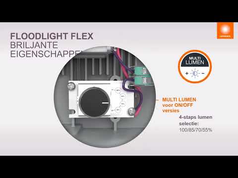 Floodlight Flex biedt een hoog lichtrendement tot 161 lm/W, en Lumenpakketten tot 70.000 lm*. Door de Multi Lumen-functie met vier vermogensstanden heeft de gebruiker optimale flexibiliteit in de keuze van de gewenste lichtstroom (on/off versies). Daarnaast zijn er ook DALI-2 versies voor lichtmanagement. Het assortiment omvat de lichtkleuren 830 en 840 en een extra versie met een warme kleurtemperatuur van 2.200K voor specifieke toepassingen zoals binnensteden. De levensduur van het armatuur is tot 120.000 uur bij 25°C (L70/B50).
